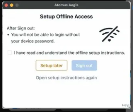 A screen titled "Setup Offline Access" will appear. After you have read the instructions. Check the box that says, "I have read and understand the offline setup instructions", then click Sign out.