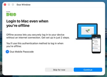 - At the macOS login screen: complete the Duo offline setup prompt