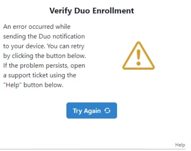What you see: "An error occured while sending the Duo notification to your device..."