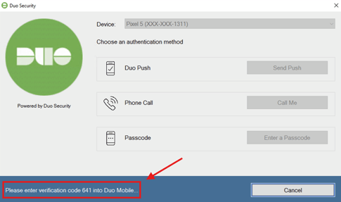 Users may instead be prompted to enter the Duo code in the push notification on their Duo mobile app (See Below).